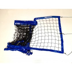 Red de voleibol playa, de medidas reglamentarias, con malla negra y bandas azules. Ideal para competencia y recreación.